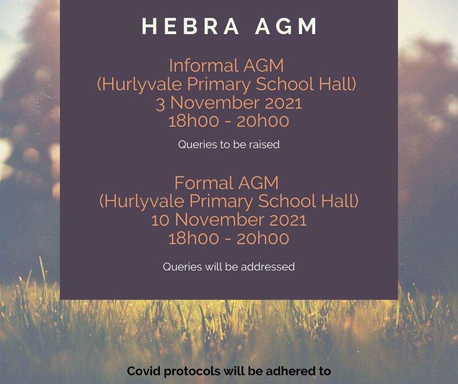 Please join us for the informal and formal HEBRA AGM’s in the Hurlyvale Primary School Hall on 3 and 10 November 2021.
