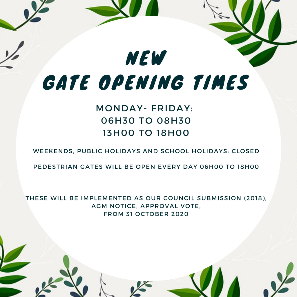 Please see the new gate times for the secondary gates (St Matthew Rd is the primary entrance) as per the council application in 2018. This was also voted on at the AGM/proxy forms. The voting outcomes may also be viewed on the website.